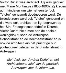 Terug naar overzicht Antwerpse begraafplaatsen Berchem Antwerpen 5 - 1 - 1837 / Antwerpen 23 - 5 - 1900 Victor Durlet Het grafmonument van Victor Durlet  bevindt zich op perk 03 - E - 04.