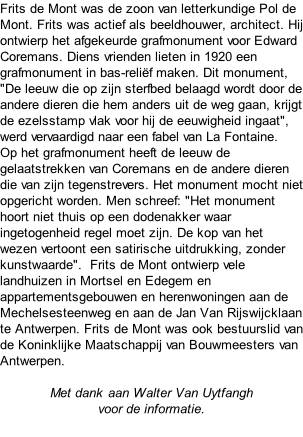 Schoonselhof Borgerhout 12 - 12 - 1883 / Antwerpen 22 - 10 - 1956 Frits de Mont Het grafmonument voor Frits de Mont bevindt zich op perk 10, Oost.