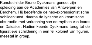 Schoonselhof Lier 7 - 10 - 1920 / Deurne 29 - 1 - 1998 Bruno Dyckmans Het  grafmonument voor Bruno Dyckmans bevindt zich op perk R, rij 6.  Op het monument leest men:  "Kleur was zijn leven, en het leven werd kleur".